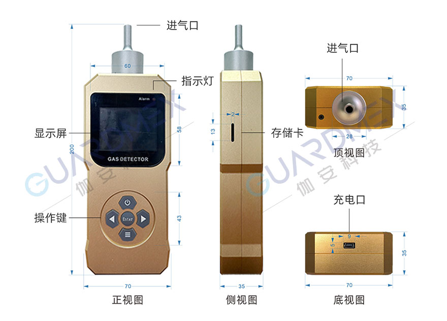 氧气 (O₂):通常采用电化学或顺磁原理,用于判断窒息风险。