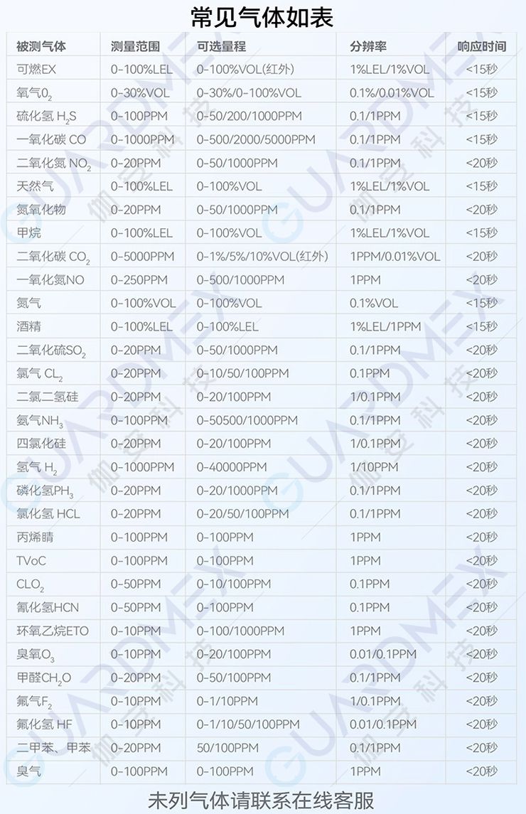 伽安科技的GM700系列 可检测气体如下列表: