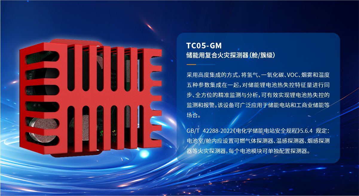 TC05-GM储能用复合火灾探测器(舱/簇级),采用高度集成的方式,将氢气、一氧化碳、VOC、烟雾和温度五种参数集成在一起,对储能锂电池热失控特征量进行同步、全方位的精准监测与分析,可有效实现锂电池热失控的监测和报警。该设备可广泛应用于储能电站和工商业储能等场合。 GB/T 42288-2022《电化学储能电站安全规程》5.6.4 规定:电池室/舱内应设置可燃气体探测器、温感探测器、烟感探测器等火灾探测器,每个电池模块可单独配置探测器。