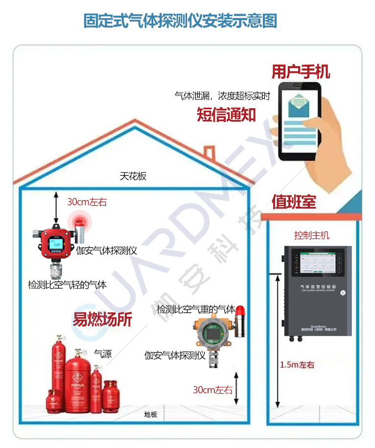 | 比空气重的气体 | 密度 > 1 | 液化石油气(如丙烷、丁烷)、甲苯、油漆蒸气、硫化氢 | 低位安装:距地面(或楼地板)0.3米至0.6米处。 | 气体泄漏后会下沉并积聚在低洼处。安装高度不能低于0.3米,以防积水溅湿损坏探测器。与燃具或阀门的水平距离宜在1米至4米之间。 |